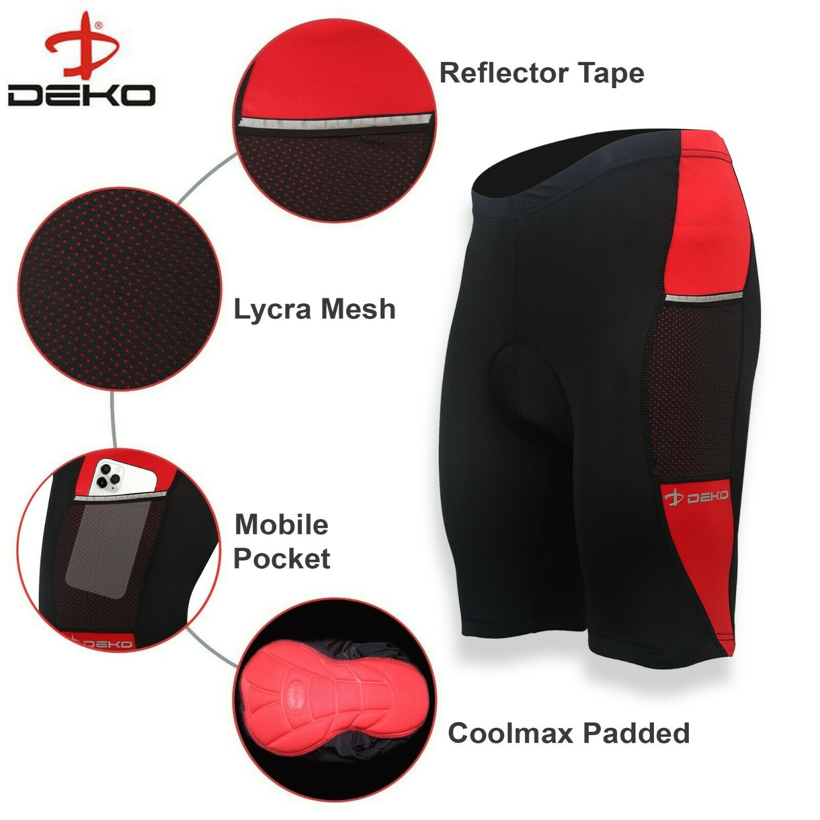 DEKO Red Men’s Cycling Shorts with Side Mobile Pocket – 3D Coolmax Padded