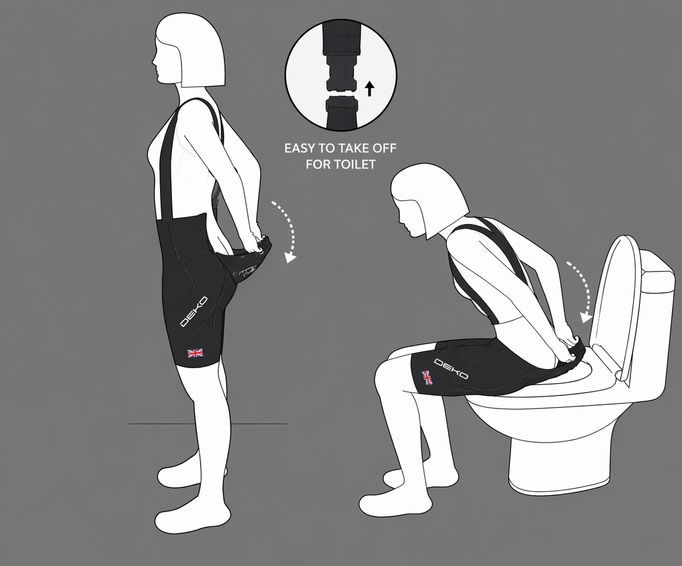 • Easy rear-release design lets you pull down from the back quickly—no need to remove your top, hassle-free toilet breaks on every ride.